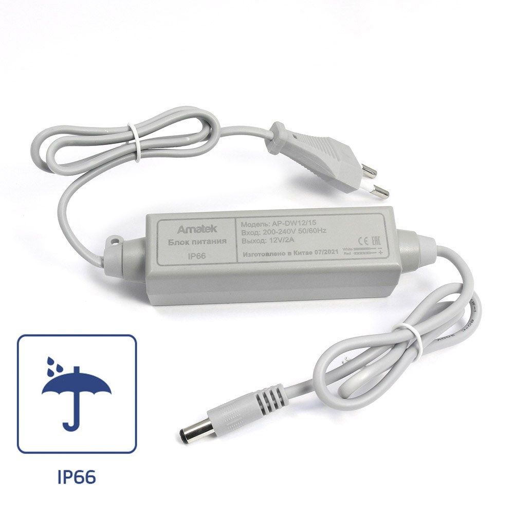 12В/1,5А, стабилизированный. Выход: 12В, 1,5А (кратковременно до 2,0А), 24Вт; вход ~200-240В, 50Гц. Защита от перегрузки и короткого замыкания с автоматическим восстановлением. Корпус 126×28×28мм с монтажным отверстием для монтажа на стену, IP66, -20°С до +45°С, 20-90% RH.