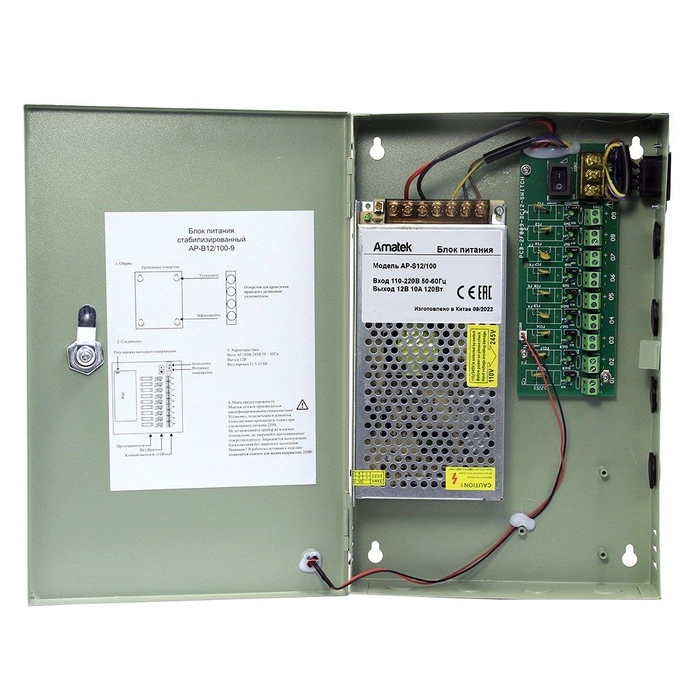 12В/10А, 9 выходов по 1,1А, стабилизированный. Регулировка выходного напряжения 11,5-13,8В. 9 выходов до 1,1А каждый, общий ток не более 10А, 120Вт. Вход ~180-245В, до 1,5А, 50Гц. Независимая защита по каждому каналу от перегрузки, повышенного входного напряжения (300В, 5 сек) и короткого замыкания с автоматическим восстановлением. Корпус металлический 315×205×52мм с возможностью монтажа на стену, -20°С до +50°С, 10-90% RH без конденсации